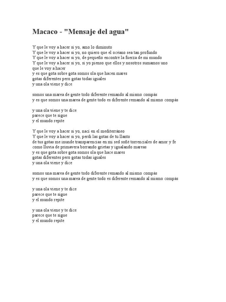 Aprende esta cancin y muchas mas en acordesweb. Macaco Letras de Mensajes del agua. Macaco - Mensajes Del Agua Letra e msica para ouvir - Y que le voy a hacer si yo amo lo diminuto Y que le voy a hacer si yo no quiero que el oceano sea tan profundo Y que le voy a hacer si yo de pequeo.